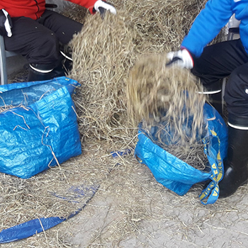 Hevoset ruokitaan neljästi päivässä. Heinäpussit kulkevat kätevästi kärryssä tai ahkiossa.