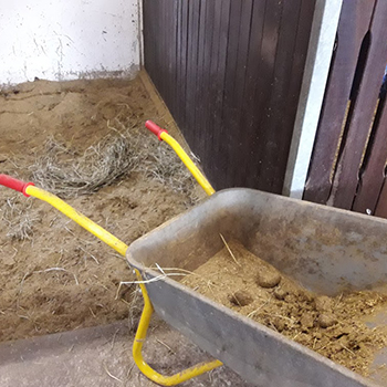 Hevosten karsinat siivotaan päivittäin. Kuivikkeena käytetään olkipellettiä.